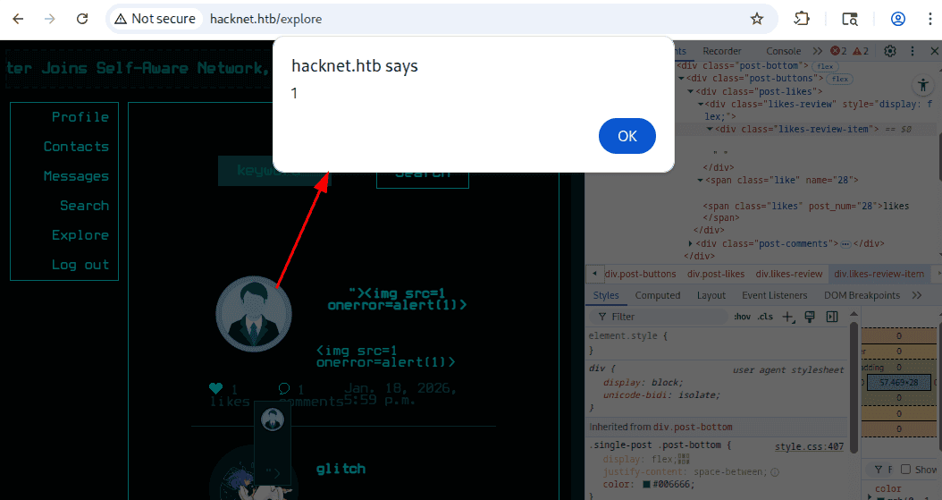 XSS zadziałał. Pozostaje teraz odpowiedzieć na pytanie, czy przyda nam się to do eksploitacji? W realnych aplikacjach - tak, o ile inny użytkownik, np. admin w swojej własnej przeglądarce kliknąłby w polubienia. Moglibyśmy wtedy np. wykraść jego ciasteczko sesyjne (jeśli nie jest zabezpieczone flagą http-only) lub wykonać dowolną akcję w jego imieniu.