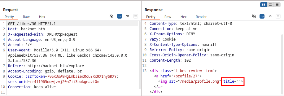 Pierwszą z propozycji w przypadku educated guess może być np. username czy usernames (w końcu widzimy nazwy użytkowników po kliknięciu w likes; payload może być np. taki: {{ usernames }}{{ username }}). Dla uproszczenie podglądu, to samo żądanie, ale w burpie: