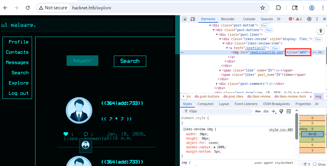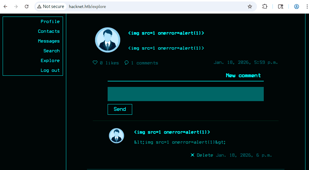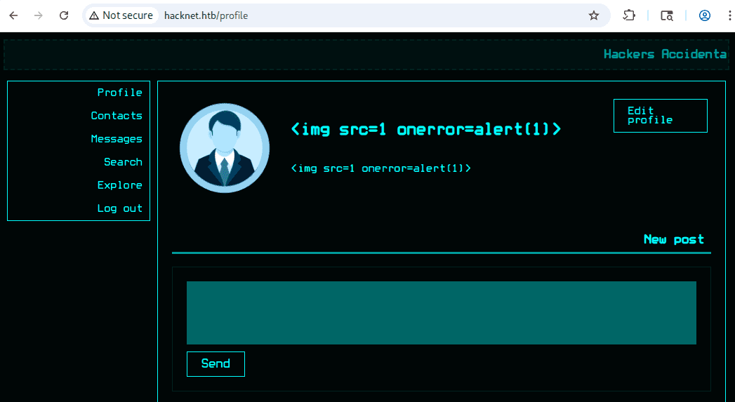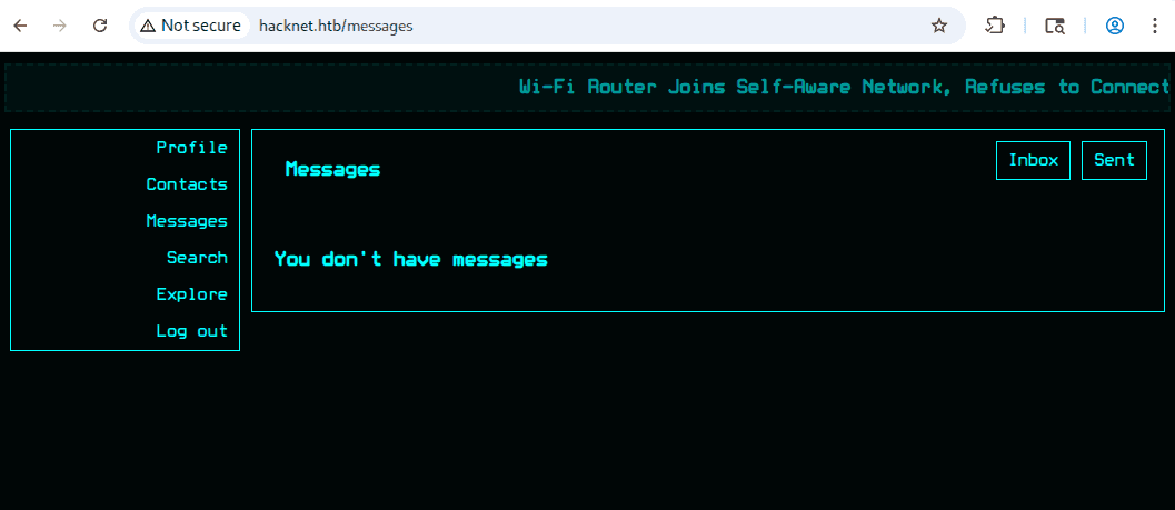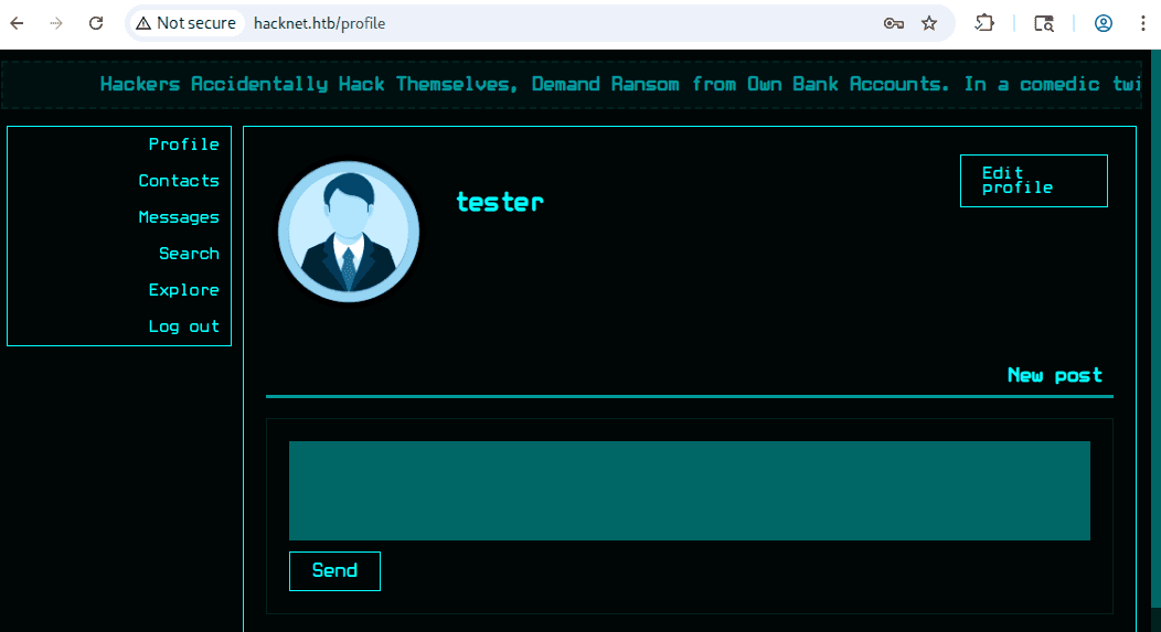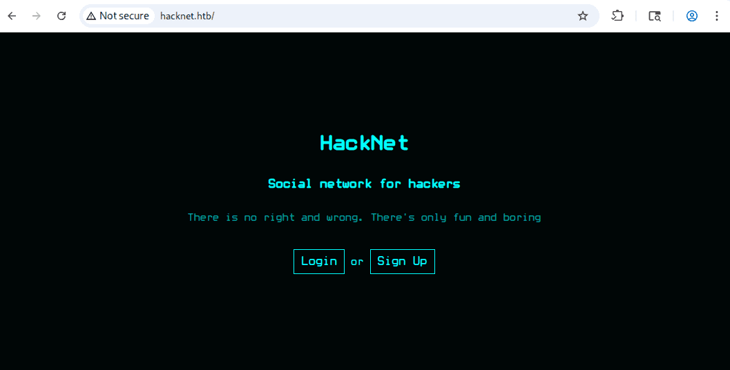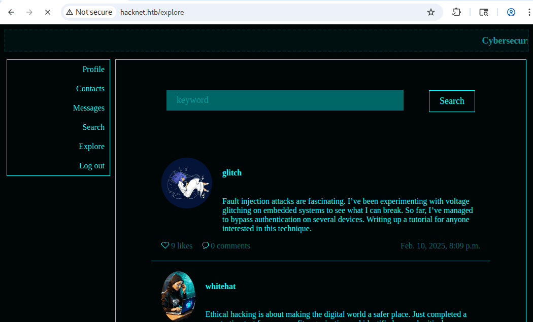 hacknet.htb to sieć społecznościowa dla hackerów, jak możemy zobserwować na stronie głównej: