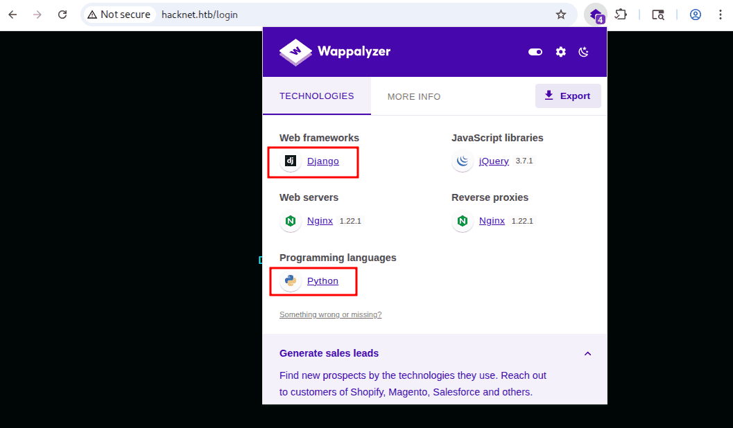 Wtyczka wappalyzer szybko znajduje technologie użyte do stworzenia aplikacji, jednak dopiero po przejściu na stronę logowania (serwer zwraca wtedy csrfmiddlewaretoken oraz ciasteczko csrftoken w odpowiedzi, co zapewne umożliwia wappalyzerowi identyfikację).