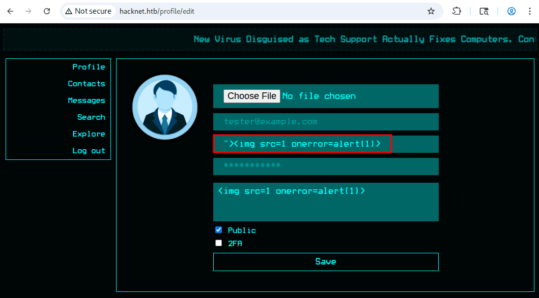 Skupmy się najpierw na pierwszej możliwej podatności - XSS. Umieśćmy typowy payload <img src=1 onerror=alert(1)> we wszystkich wspomnianych wyżej miejscach: