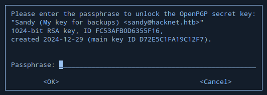 sandy@hacknet:~$ gpg --decrypt /var/www/HackNet/backups/backup02.sql.gpg > /tmp/backup02.sql