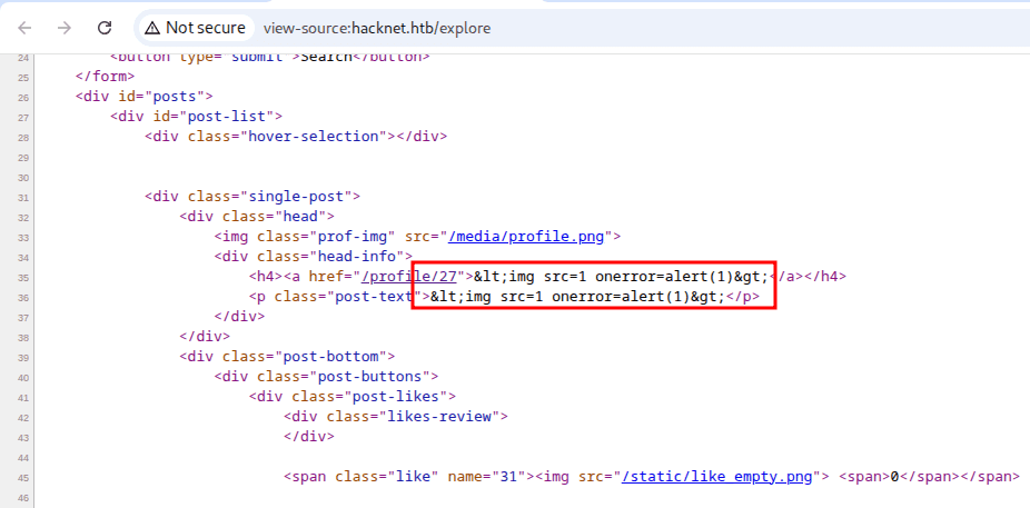 Aby nasz xss mógł się udać, potrzebujemy więc wyskoczyć z kontekstu atrybutu, dodając po prostu znaki "> w nazwie użytkownika. Jeśli niebezpieczne znaki (takie jak >,<,",' itp), nie będą zakodowane jako encja html, to mamy szanse na XSSa.