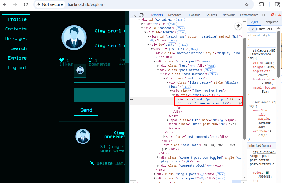 XSS zadziałał. Pozostaje teraz odpowiedzieć na pytanie, czy przyda nam się to do eksploitacji? W realnych aplikacjach - tak, o ile inny użytkownik, np. admin w swojej własnej przeglądarce kliknąłby w polubienia. Moglibyśmy wtedy np. wykraść jego ciasteczko sesyjne (jeśli nie jest zabezpieczone flagą http-only) lub wykonać dowolną akcję w jego imieniu.