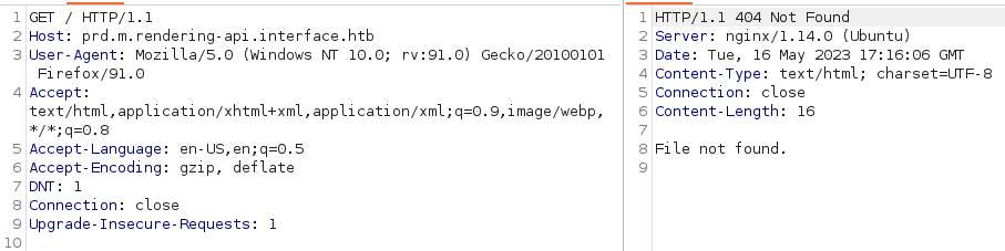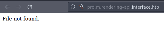 Error: the server returns a status code that matches the provided options for non existing urls. http://prd.m.rendering-api.interface.htb/ca84006a-80bf-4f65-a812-2cba04e0bb61 => 404 (Length: 0). To continue please exclude the status code or the length