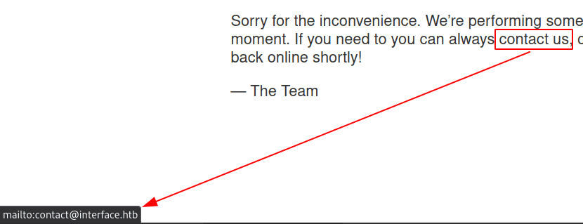 Najechanie jednak myszka na contact us odsłania zaszytego maila [email protected], który zawiera też nazwę hosta: interface.htb. Dodajemy więc nowy rekord 10.10.11.200 interface.htb do pliku /etc/hosts, by móc odwołać się do maszyny właśnie po tej nazwie.