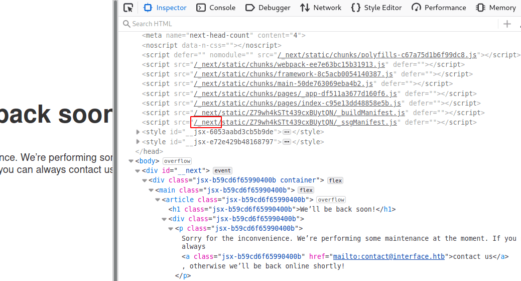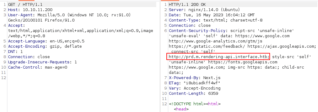Od razu w oczy rzuca się nieznana dotąd subdomena http://prd.m.rendering-api.interface.htb wskazująca na pewnego rodzaju API. Dodajemy ją więc do pliku /etc/hosts. W nagłówkach widzimy rownież potwierdzenie wykorzystania frameworka Next.js (X-Powered-By: Next.js).
