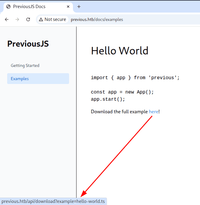 Po przejrzeniu aplikacji, szybko odnajdujemy endpoint /api/download?example=hello-world.ts: