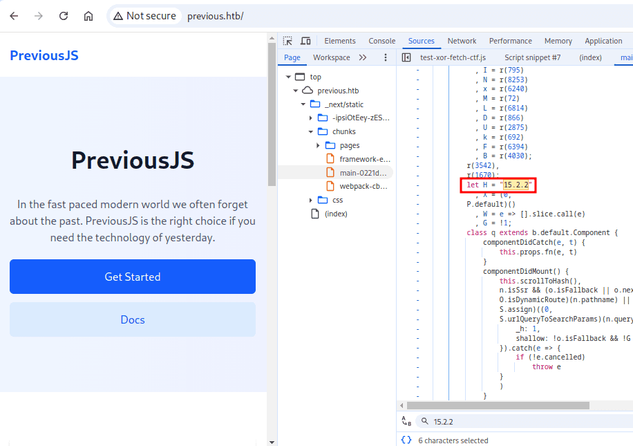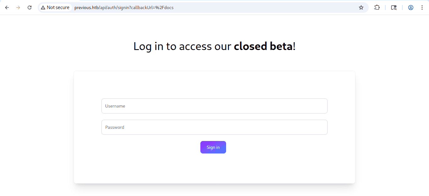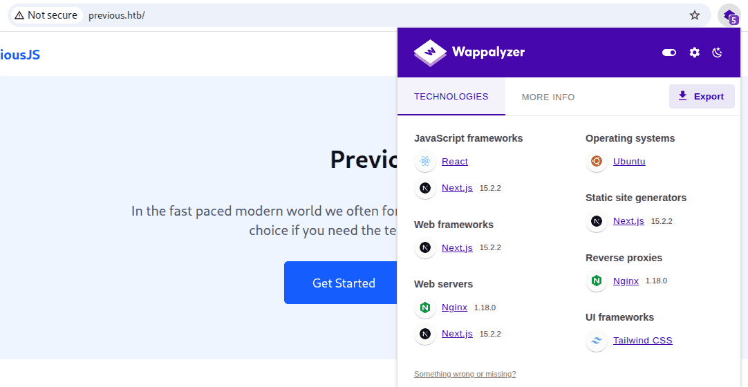 Nmap od razu wykrył przekierowanie na domenę previous.htb, możemy więc umieścić ją w pliku /etc/hosts dla łatwiejszej interakcji z usługą http.