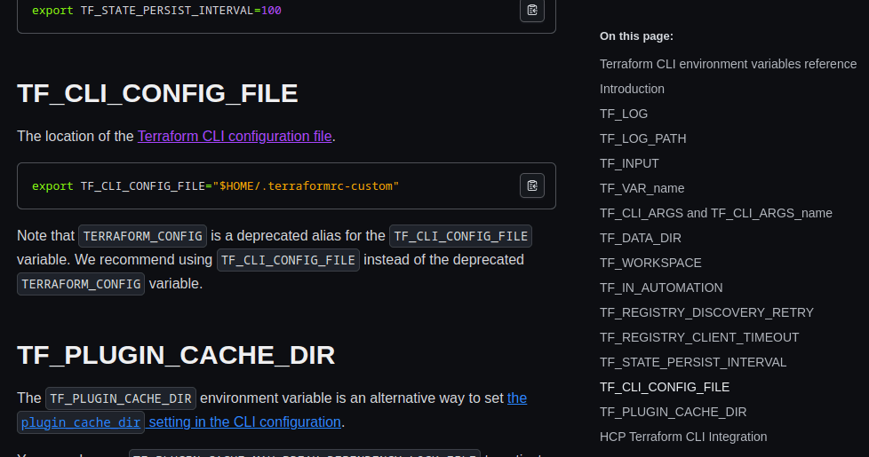 destination_path = "/home/jeremy/docker/previous/public/examples/hello-world.ts"Łącząc to wszystko możemy założyć, że ścieżka eskalacji będzie bazować na jakiejś zmiennej środowiskowej działającej w terraform. Wśród wielu takich zmiennych, z całą pewnością wyróżnia się TF_CLI_CONFIG_FILE: