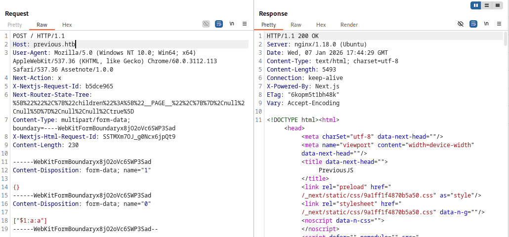Typowe ataki na formularz logowania jak sql injection, nosql injection itd. nie przyniosły porządanego efektu. Następną metodą, którą warto przetestować w przypadku next.js są głośne ostatnimi czasy podatności - CVE-2025-55182 oraz CVE-2025-29927.