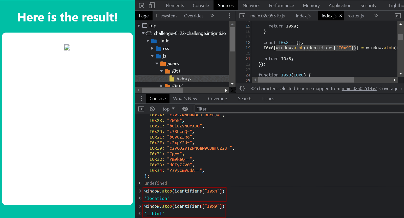 Each route renders a different React element, the “index” route renders <I0x1C> and the “result” route <I0x1>. There is also a big object called identifiers containing key-value pair data with values endcoded in base64 format. This object is passed as a identifiers property to both of these elements. Please, remember this object, we will need it later.