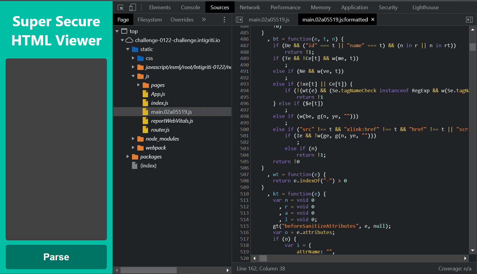 We can see that the webpage loads main.02a05519.js but this file is minified so it’s really hard to read and understand. challenge 0122 6