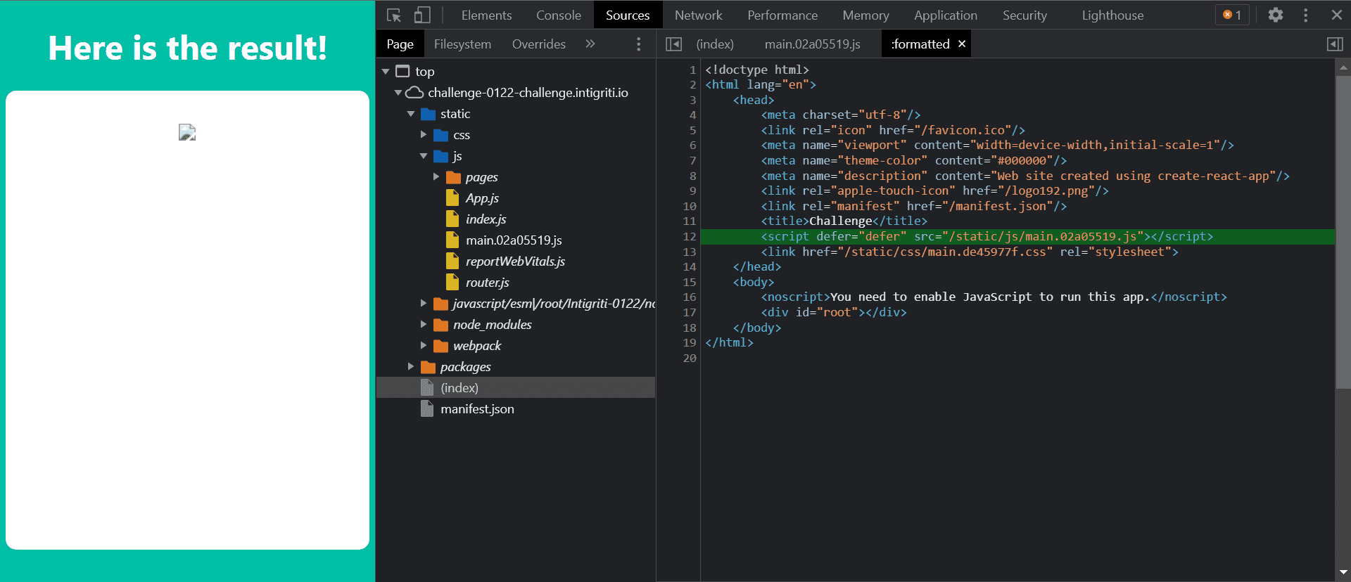 Now let’s go to the Sources panel in DevTools and look at the real source-code. challenge 0122 5